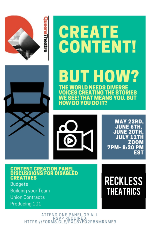 Image description: 7 multicolor boxes appear on a white background. From top right to bottom left, the boxes include 1. Queens Theatre’s logo 2. Green box with yellow text reading: Create Content! But how? The world needs diverse voices creating the stories we see! That means YOU. But how do you do it? 3. Blue rectangle with a black director’s chair 4. Black box with a white camera 5. Blue box with white text reading: May 23rd, June 6th, June 20th, July 11th, Zoom, 7pm-8:30pm EST 6. Green rectangle with yellow text reading: Content Creation Panel Discussions for Disabled Creatives. Budgets. Building your team. Unions Contracts. Producing 101. 7. Reckless Theatrics’ logo.